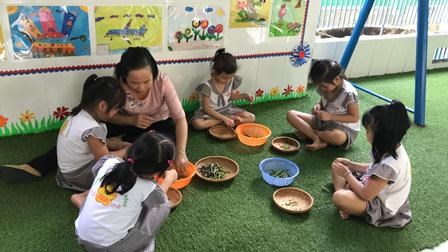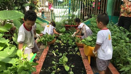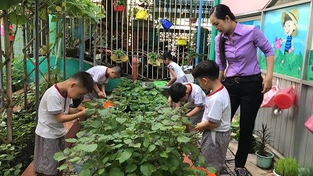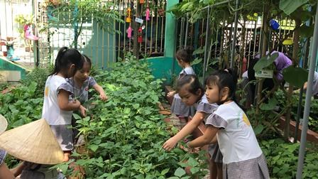 Chăm sóc cây xanh không chỉ góp phần tạo cảnh quan môi truờng "xanh - sạch - đẹp" trong nhà truờng mà còn giúp trẻ có không gian thoáng mát để vui chơi, họat động ngoài trời, được trải nghiệm và làm quen với thế giới thực vật sinh động. Giờ học ngoại khóa tại vườn truờng, các bé được tham gia hoạt động trồng trọt, quan sát cây xanh, qua đó phân biệt được các loại cây, các loại rau, củ, quả... biết chăm sóc và thu hoạch cây trồng, đồng thời nhận thức được lợi ích của việc trồng rau sạch đối với môi trường sống xung quanh.